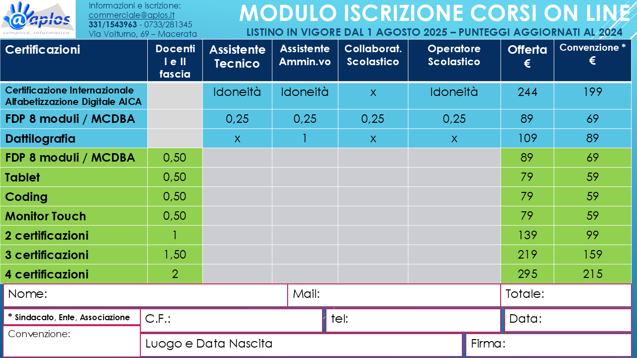 - inviare copia del pagamento e del modulo di iscrizione via mail a: formazione@aplos.it